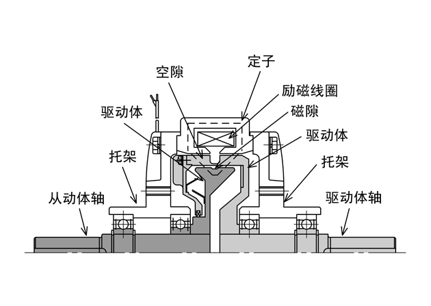 磁粉离合器是由主动转子(输入轴)、从动转子(输出轴)、含激磁线圈的磁轭组成,三部分相对同心装配,形成了一个可以相对转动的整体,在主动转子和从动转子之间的环形空隙(工作腔)内填有高导磁的合金磁粉。而对构成磁粉离合器磁路的各种磁体,一般都应选用导磁率高,矫顽力低和单位损耗小的软磁材料制成,这些材料均须要经过适当的热处理以得到良好的磁性能。对于使用不太重要的离合器,可以采用比较经济的铸铁系做导磁体。当需要减少导磁体的涡流影响,缩小转矩时间常数时,可采用电阻率较高的材料,比如硅钢、铁铝系合金等。